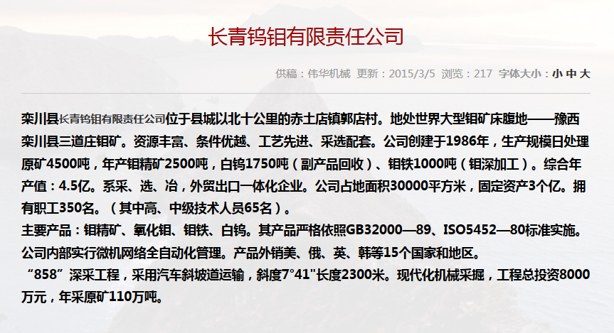 合作單位:長(zhǎng)青鎢鉬有限責(zé)任公司